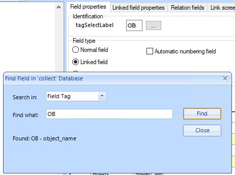 In the Find field dialog, first select whether you'd like to search on a tag or a field name, in the Search in drop-down. When searching on tag, type the entire tag and click Find. The search will be case-sensitive. If a single tag is found, this tag will automatically be selected in the tree view and its properties will be displayed on the right. Click Close if you don't need to search again.