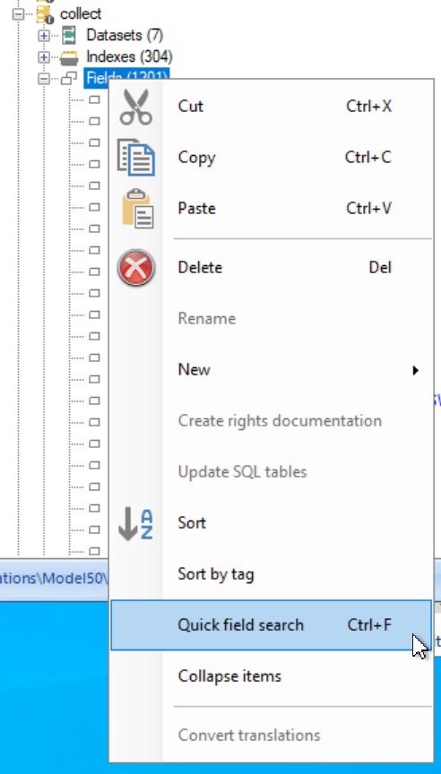 Finding a field name or field tag in the field list underneath an .inf node in the tree view is always a bit cumbersome: you have to sort the list and scroll to the desired field or use the filter option in the Field list. A quicker way has now been implemented, even if you know only part of the field name. Simply select either the database table (like collect or thesau for example) node, the Fields node or a single field in the tree view on the left of the Application browser en press Ctrl+F or right-click the database table node or the Fields node and select the Quick field search option in the pop-up menu.