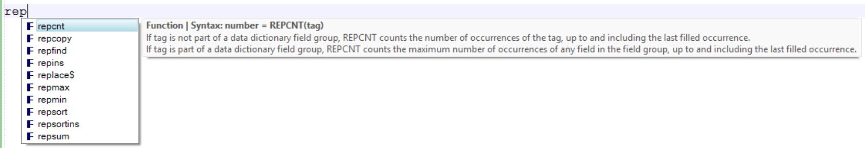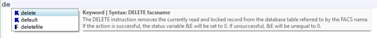 Auto-complete functionality for ADAPL keywords, functions and '&' variables has been added. So as you're typing your code, the editor will present a list of all the keywords, functions and reserved variables matching what you typed so far. You can scroll through the list using the mouse scroll wheel, by dragging the scroll bar in the list or by using your arrow keys and copy the highlighted item to your code by pressing Enter or by double-clicking any of the visible items. A tooltip explaining the selected item and showing its syntax is displayed as well.