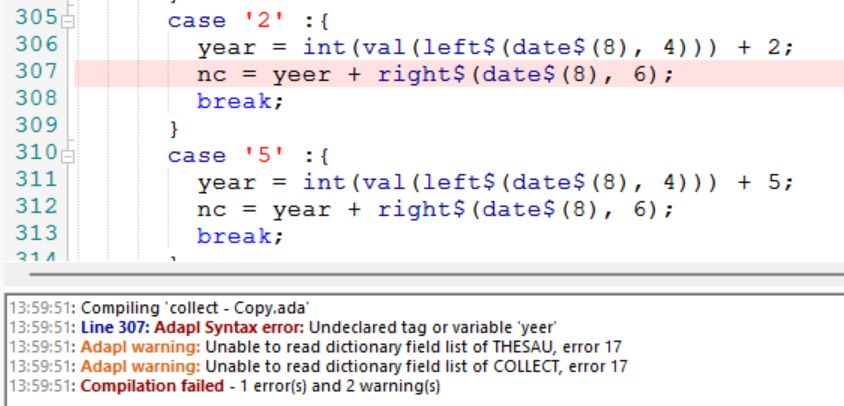 To compile an adapl, right-click the code and select one of the Compile options from the pop-up menu. In the bottom window pane, the result of the compile attempt is clearly shown: "Compilation failed" in red font type or "Compilation successful" in green font type. It also indicates if compiling was done in debug mode. If compiling failed, just double-click the line stating the error to have the code automatically scroll to the relevant line and select it for you, so you don't have to look it up yourself. The line with the error will be highlighted in light red at first, but will turn to purple once the entire line is selected.