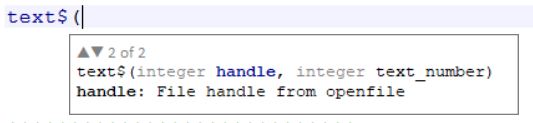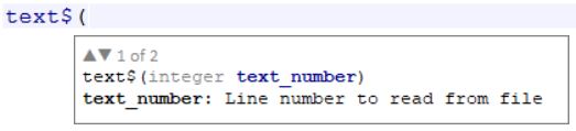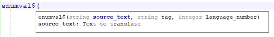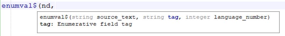 For ADAPL commands which take parameters, a parameters hints tooltip shows up as soon as you type the bracket behind the command. As you type the parameters/arguments for the relevant function the hints tooltip remains visible to provide help. It even keeps track of the position of the parameter you are currently entering and highlights the matching parameter in the hint in blue and provides a description of that parameter in the next line. For example, after typing ( behind enumval$, the source_text parameter in the hint is highlighted with its explanation underneath it, while after entering that parameter and having typed a comma, the tag parameter is highlighted.