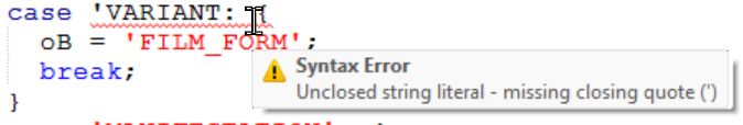 The editor now has the ability to detect certain syntax errors. Currently only unclosed literal strings are detected and will be marked with a red squiggly line. Move the mouse cursor over the relevant line to get a tooltip explaining the error.