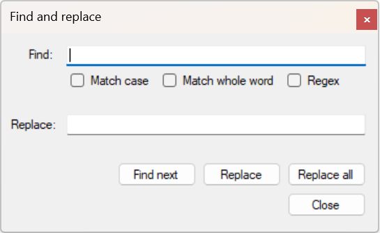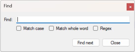 Enter any partial or complete string to search for in the code and comments and optionally mark Match case or Match whole word. You can also (instead) enter a regular expression, but then do mark the Regex checkbox. Click Find next to start the search. The dialog remains open so you can click Find next repeatedly to find each following occurrence of the string. You can edit the code while the dialog is open.![]() |