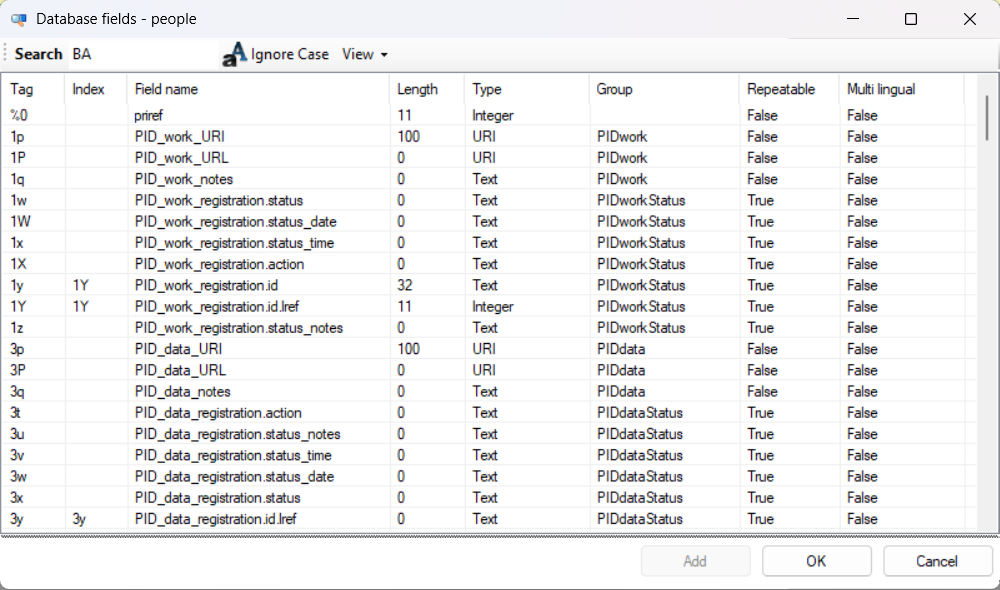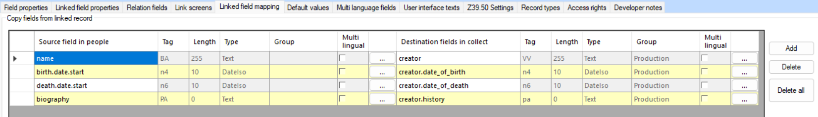 To make better use of available space on the Linked field mapping properties tab of a selected linked field in the Application browser and to provide more information about which fields you are actually mapping, new properties columns have been added for field Tag, Length (the field length of two mapped fields should be equal, although the destination field is allowed to be larger), Type (the type of two mapped fields should be identical), Group (the destination fields should be part of one and the same field group while the source fields should either be part of one and the same field group or not be part of any field group) and Multilingual (either both fields in a mapping should be multilingual or neither should be). You can't edit these properties here, so that's why they're greyed out.