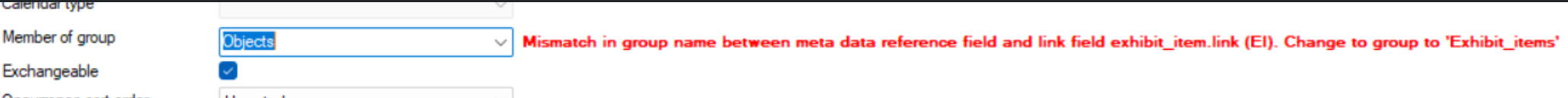Therefore, when setting the field group name for a meta data reference field to anything other than the group name of the indexed link field it is associated with, Designer now will report that immediately behind the Member of group property and prevent saving until you select the proper group name: