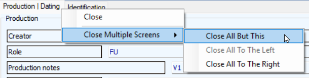 Right-click the tab of an opened screen file to open a context menu with different Close options. Close (Ctrl+W) closes the current screen file, or select one of the other options to close multiple opened screen files.