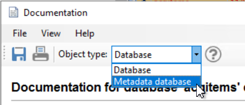 From Designer version 7.18 onwards, the dynamically generated application configuration documentation (via the Create documentation option in the right-click pop-up menu for .infs, the .pbk, screen files and folders containing those files, now also includes settings for full text indexing, indexed links, metadata databases and internal links. If you right-clicked a folder (like the /data folder) and it contains more than one file type, you can open the Object type drop-down to select for which type the documentation must be created. If the drop-down is read-only, you can't select a different object type for the selected node. Although .inf's for normal database tables and .link files for metadata database tables are considered different object types, from the View menu you can select the same document types (although some sections in the documentation for metadata database tables do not apply and will remain empty) and you could create documents for both and combine them later manually if desired.