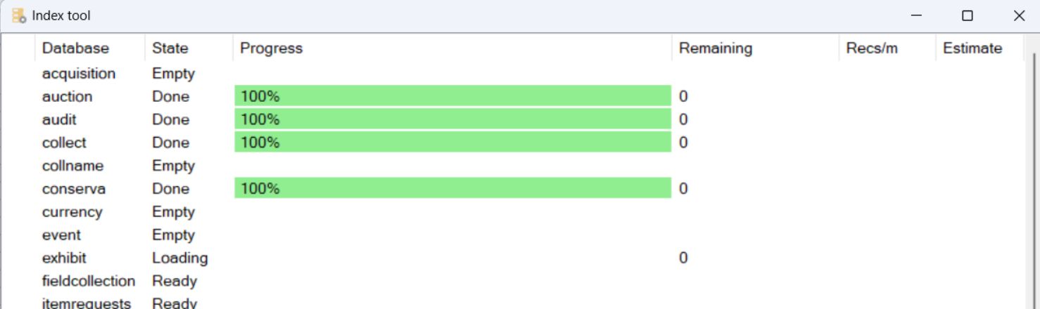 And when using the Designer implementation of the IndexTool, any existing indexes can't be dropped before re-indexing. Error reports and other messages will appear in the main Axiell Designer window.
